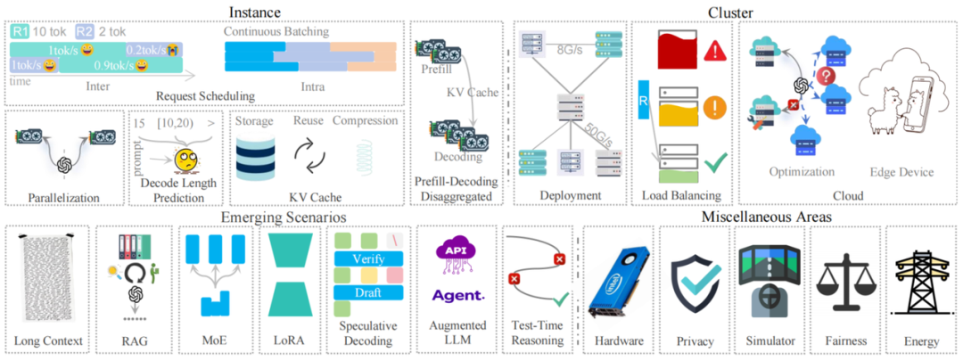 集群优化: 专注于部署策略, 尤其是高性价比的GPU集群配置, 使用异构硬件, 进行服务的集群调度。动态扩缩容引入负载均衡, 以防资源未充分利用, 或不同实例过载。本地硬件基础架构不足以支持部署要求时, 云服务方案解决动态大模型服务的需求。