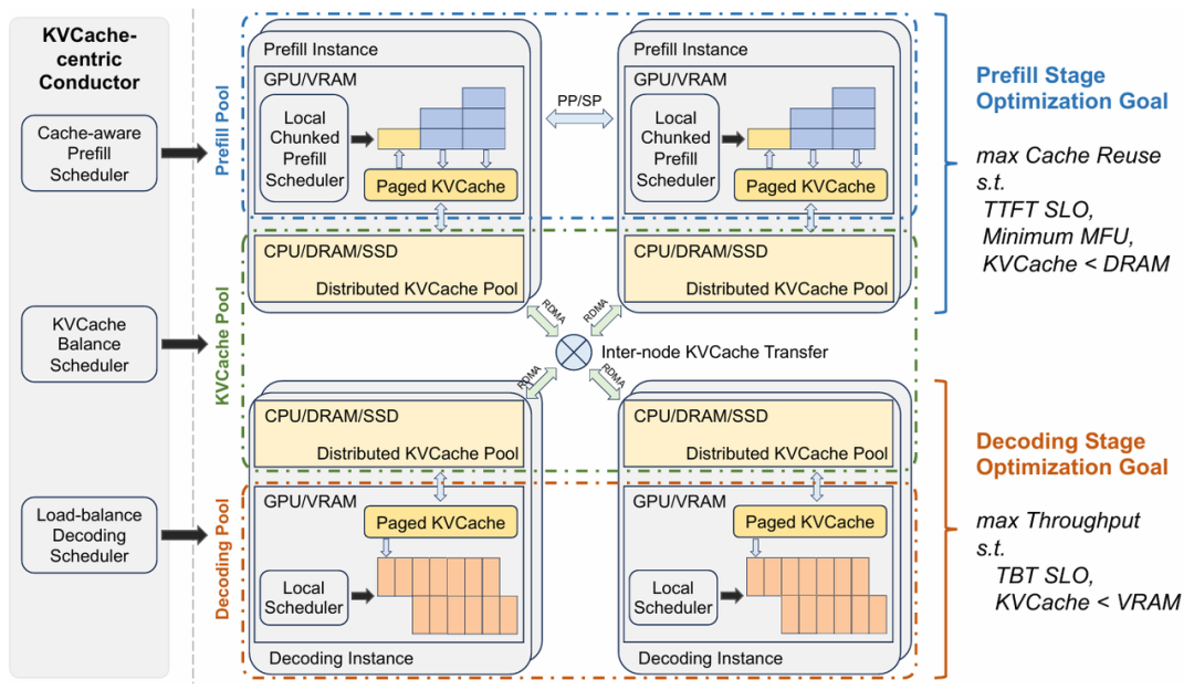 Mooncake 不仅分离 prefill 和 decoding 节点, 还把 CPU, DRAM, SSD, RDMA, GPU 集群资源分组, 实现 KVCache 分离。