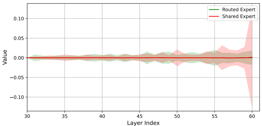 下图中展示了路由专家在各网络层均保持着与共享专家相当的贡献强度,这种均衡的协同作用有效提升了模型的整体表征能力。