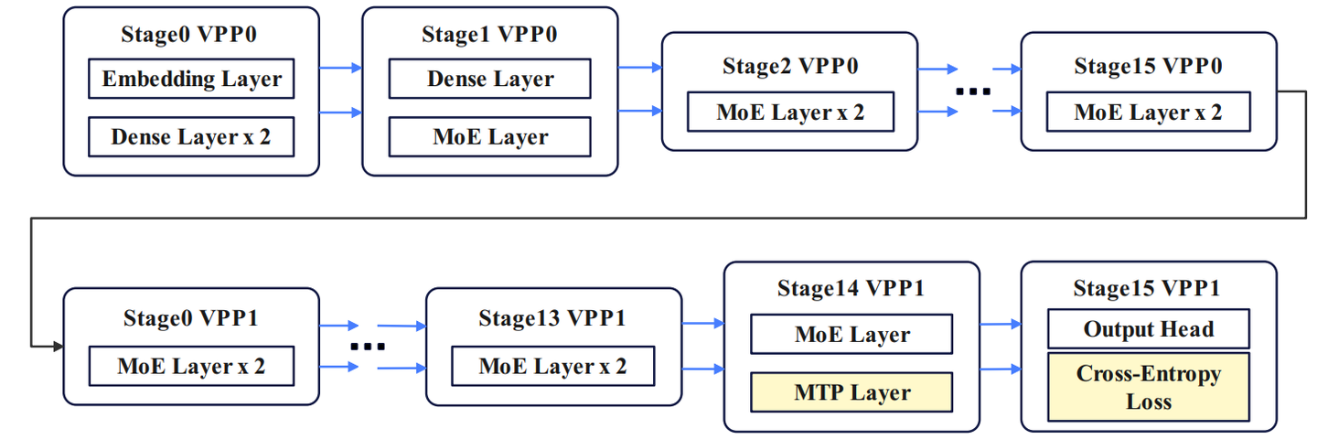 在流水线编排亲和方面,采用PP(流水线并行)、VPP(可变流水线并行)、空层等技术,实现PP和VPP的负载均衡,减少计算资源闲置(空泡)的情况。