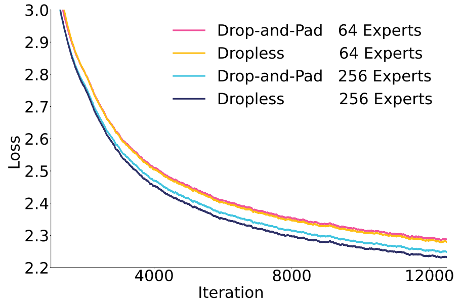 团队首先在一个20B的先导MoE上对比了不同专家总数下drop-and-pad和dropless的性能:
