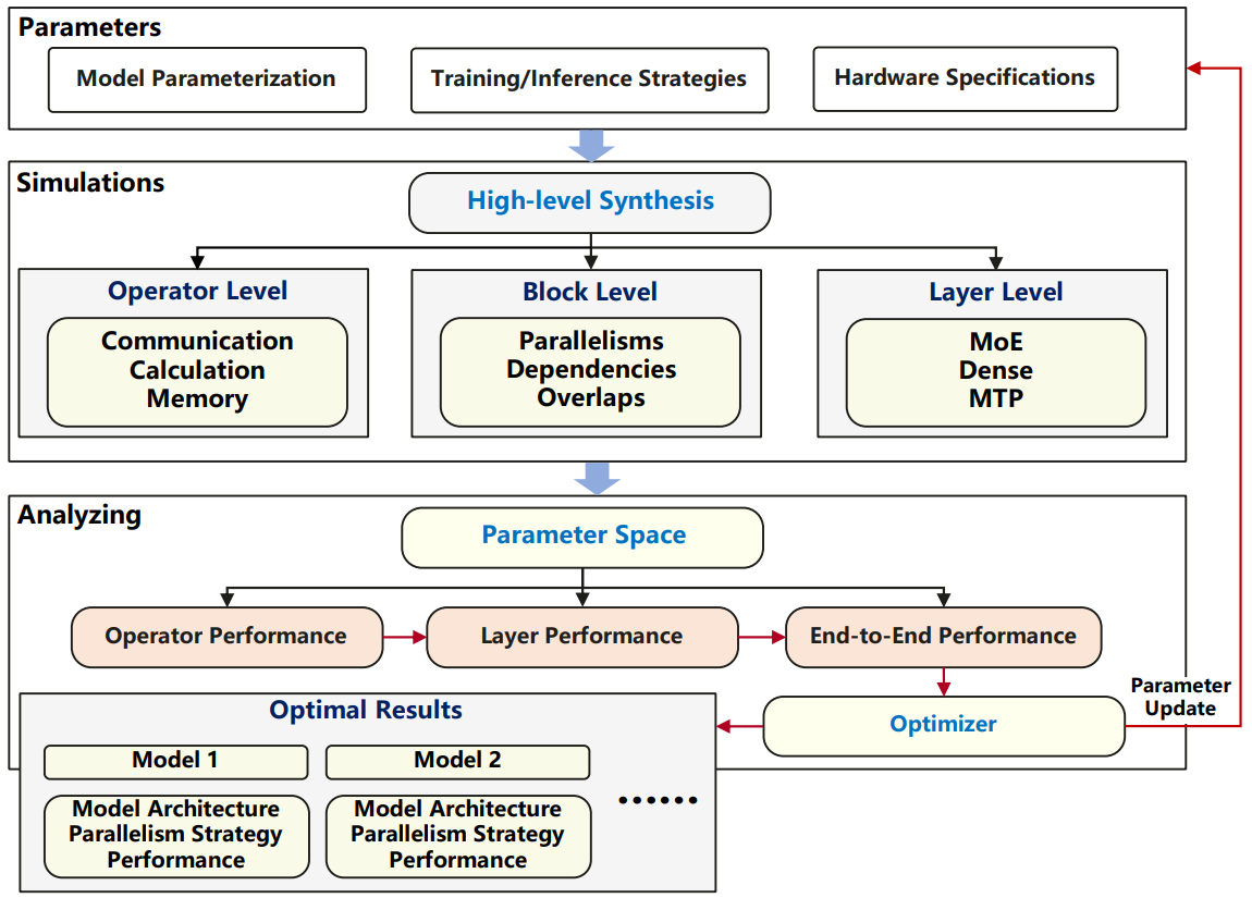 为了能更准确地知道不同模型的性能极限,团队开发了一套专门的建模仿真工具。这个工具很厉害,它把模型结构、运行时采用的策略,还有硬件系统,都拆分成了一个个小的参数。