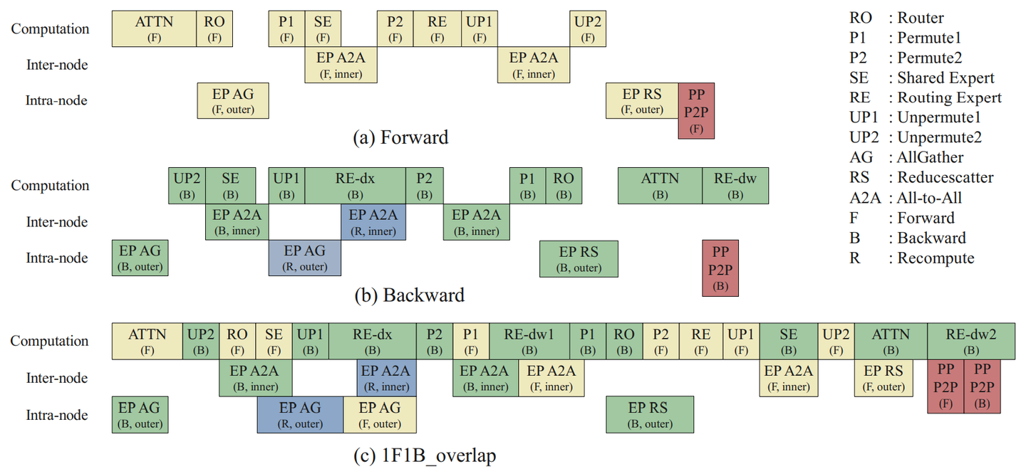 核心设计包括:利用机间与机内通信链路带宽独立特点实现机内通信与机间通信的互相掩盖,利用算子的有效排布缓解host bound,将专家反向dw计算与dx计算分离做更细粒度的掩盖。