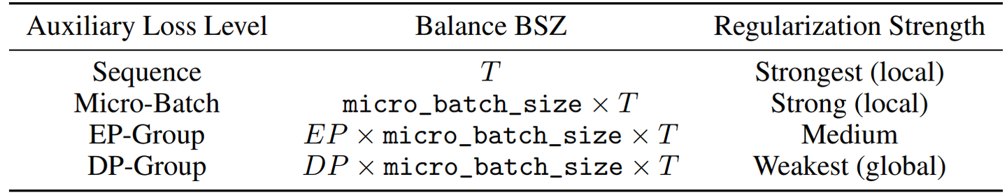 这些辅助损失函数,就像是给MoE模型里的路由模块(负责分配任务的部分)定了规矩,通过不同程度的约束,让它把任务分配得更均匀一些。具体的约束情况,都整理在下面的表格里了。