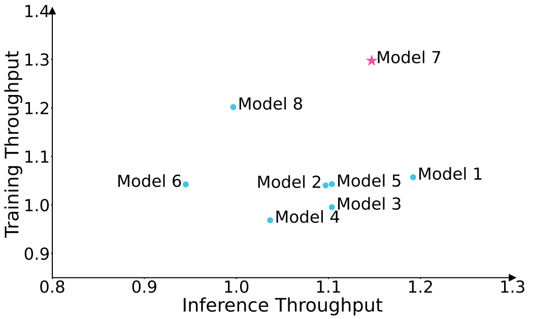 团队用这个建模仿真工具,把所有符合硬件适配要求的参数组合都测试了一遍,仔细评估它们在训练和推理时的数据处理速度,最后找到了性能相对更好的模型结构,具体情况可以看下面的图。