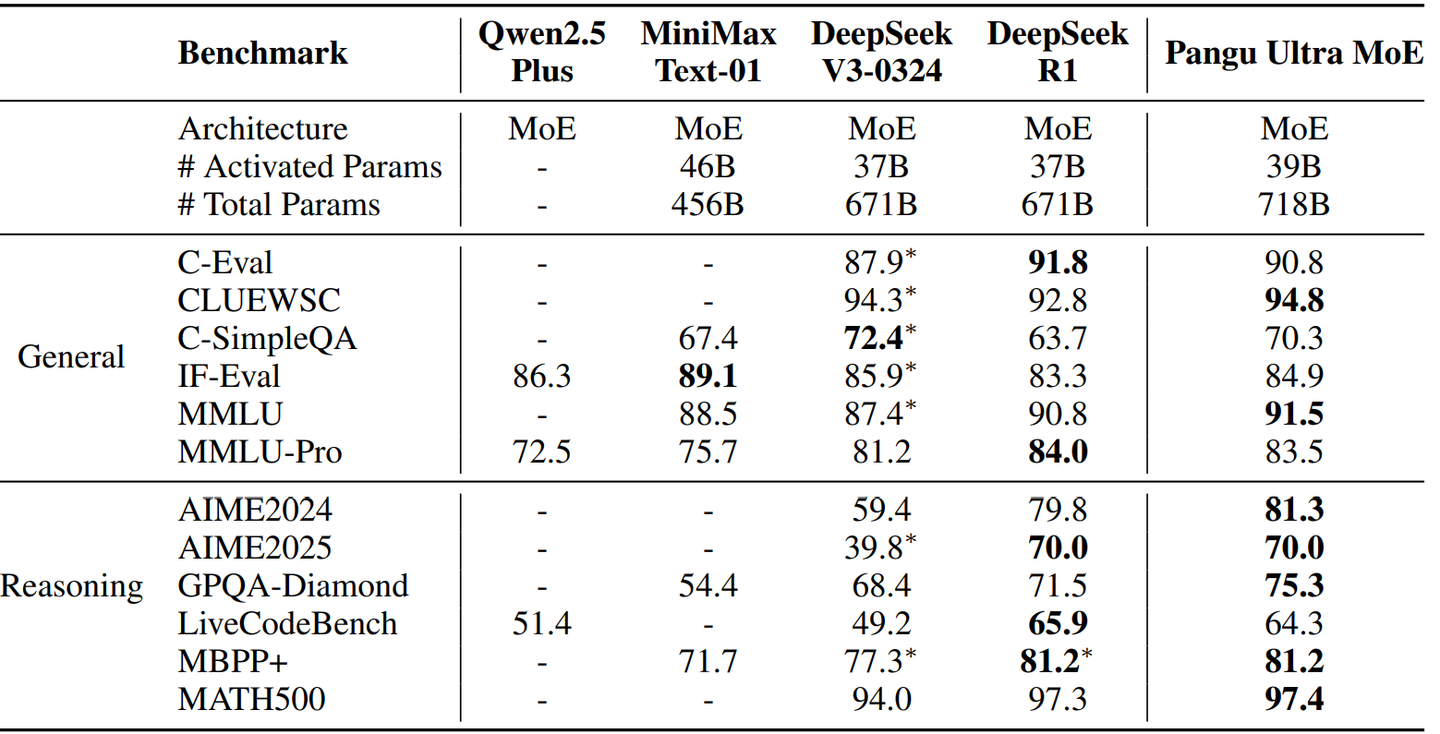 实验表明,盘古Ultra MoE对话版本在多领域均展现出卓越竞争力,在大多数benchmark上与DeepSeek-R1表现相当。比如通用理解任务(如CLUEWSC 94.8分、MMLU 91.5分)中展现卓越理解力,在数学推理与代码生成等高难度测试(如AIME2024 81.3分、MBPP+ 81.2分)中表现优异,具备突出的代码与数学解题能力。