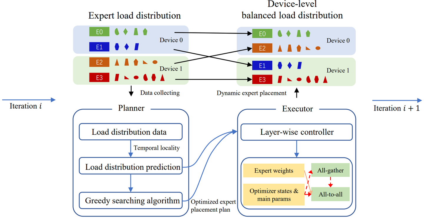 首先,规划器就像一个“小管家”,通过观察一段时间内专家的工作负载情况,预测未来的任务量,再用贪心算法规划出如何重新分配专家,让设备间的任务更均衡。