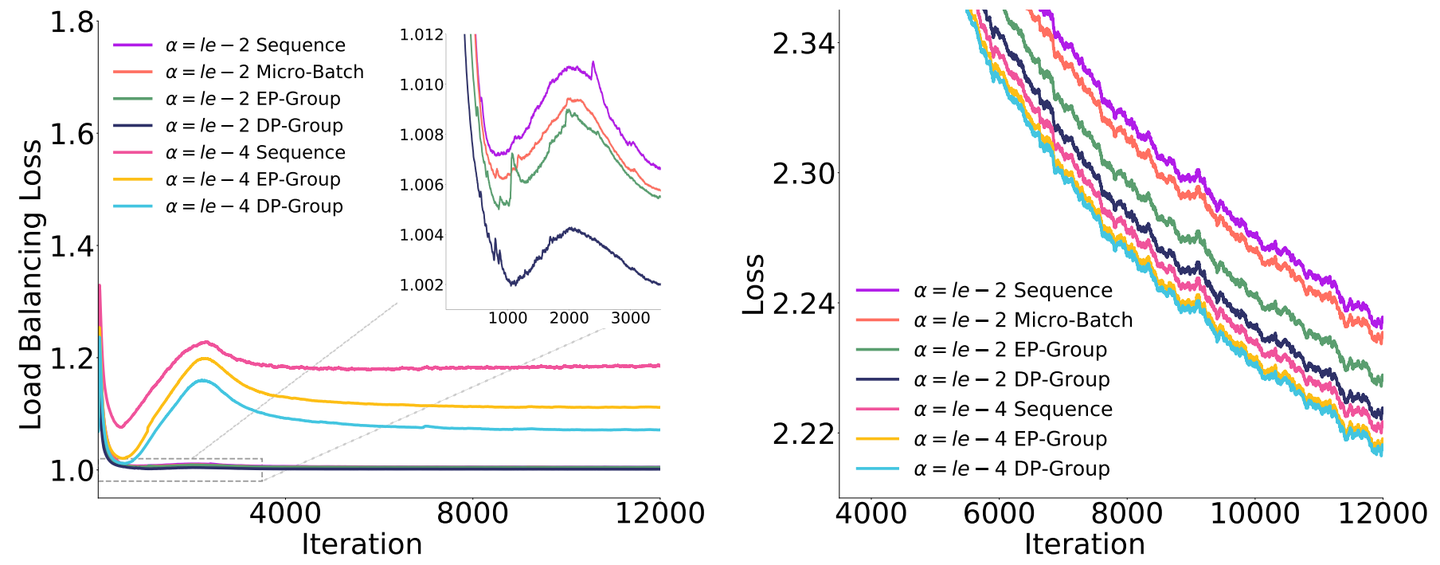 和传统的micro-batch辅助损失相比,它不会过度强求局部任务分配的绝对均衡,避免了“矫枉过正”;跟DP组的均衡损失比起来,它在数据传输时耗费的资源更少,能节省不少通信成本。