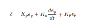 3)原理:PID控制是经典反馈控制方法,通过比例(P)、积分(I)、微分(D)环节线性组合误差信号,实现快速响应与稳态误差消除。PID实时计算目标路径与车辆实际位置的横向偏差ey和航向偏差 eθ,结合比例、积分、微分项生成控制指令。