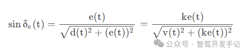 在不考虑横向跟踪误差的情况下,前轮偏角和给定路径切线方向一致,如图所示。其中θe表示车辆航向与最近路径点切线方向之间的夹角,在没有任何横向误差的情况下,前轮方向与所在路径点的方向相同: