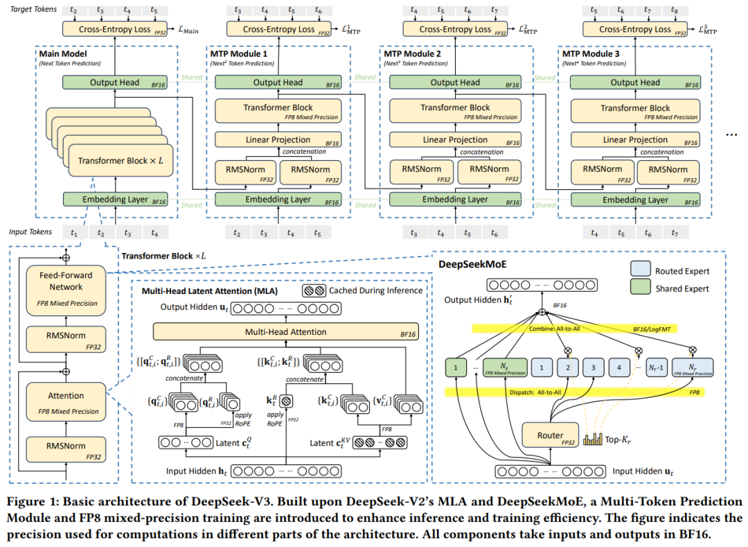 此外,DeepSeek-V3 引入了 FP8 混合精度训练技术,在保证模型质量的同时大幅降低了计算成本,使大规模训练更加可行。