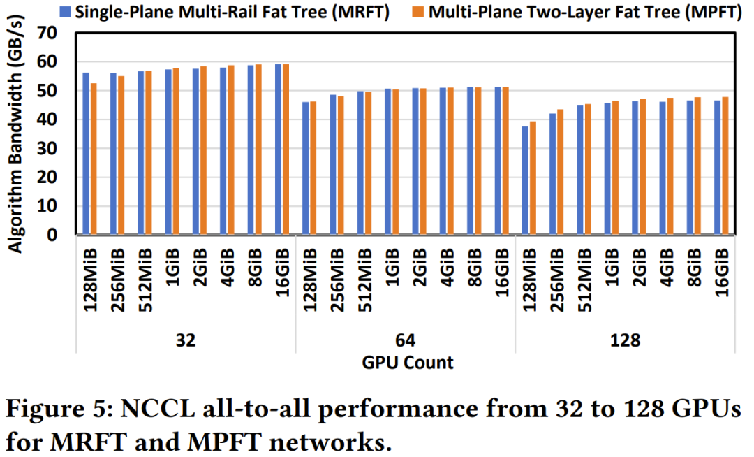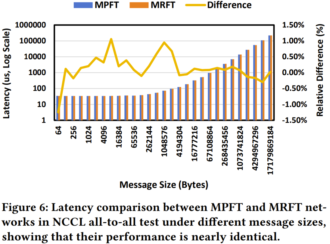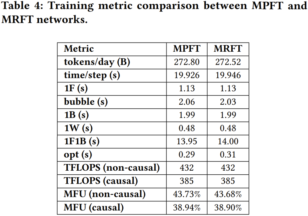 DeepSeek 还对 MPFT 和 MRFT 进行了对比性的性能分析,结果见图 5 和 6 以及表 4。