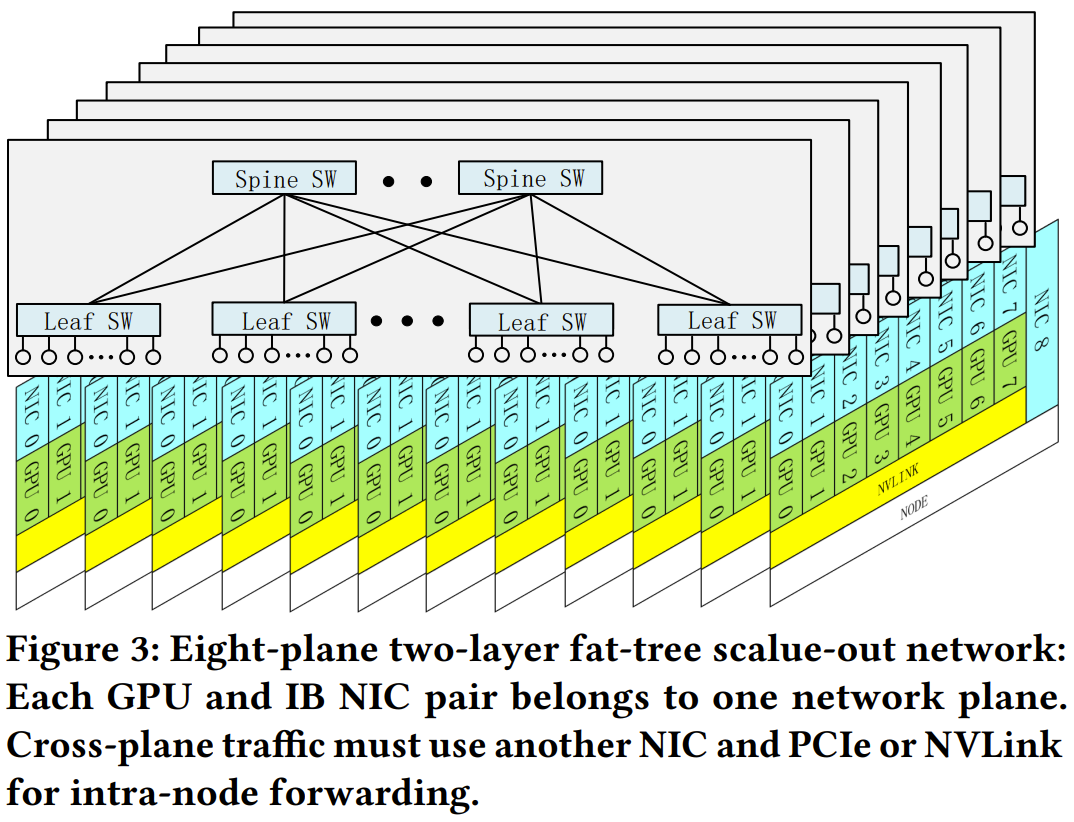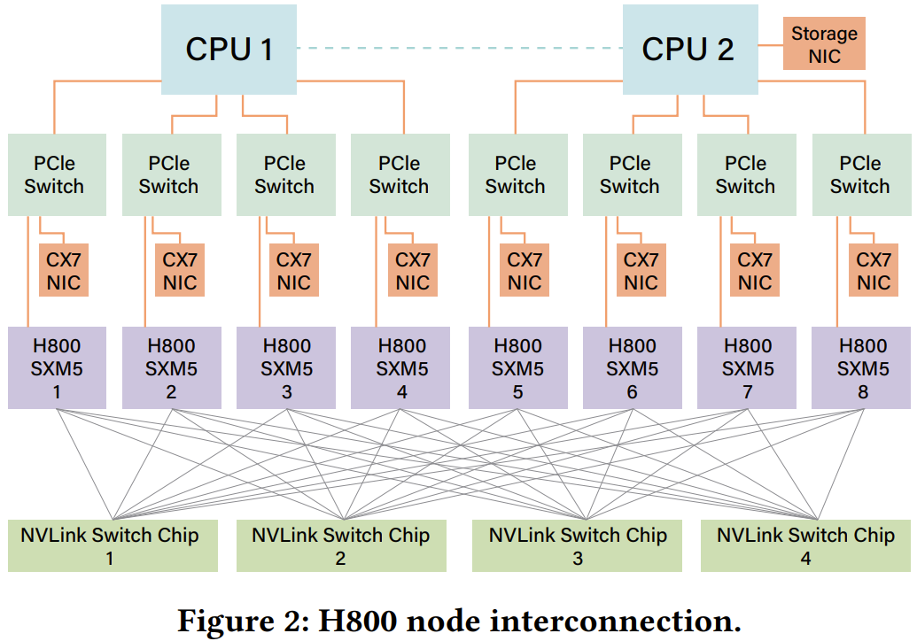 DeepSeek 目前使用的 NVIDIA H800 GPU SXM 架构(如图 2 所示)基于 Hopper 架构构建,与 H100 GPU 类似。然而,为了符合法规要求,它的 FP64 计算性能和 NVLink 带宽有所降低。具体而言,H800 SXM 节点中的 NVLink 带宽从 900 GB/s 降至了 400 GB/s。节点内扩展带宽的显著降低对高性能工作负载构成了挑战。为了弥补这一缺陷,每个节点都配备了八个 400G Infiniband (IB) CX7 网卡,以增强扩展能力,从而弥补带宽不足。