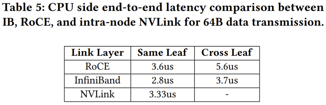 首先分析一下 IB 或 RoCE。如表 5 所示,IB 始终能保持较低的延迟,这使得使其成为了分布式训练和推理等延迟敏感型工作负载的首选。尽管 IB 的延迟性能优于基于融合以太网的 RDMA (RoCE),但它也存在一些局限性,包括成本和扩展性方面的问题。
