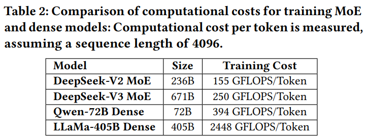 如表 2 所示,DeepSeekV3 的总计算成本约为每 token 250 GFLOPS,而 72B 密集模型需要 394 GFLOPS,405B 密集模型则需要 2448 GFLOPS。这表明,MoE 模型在计算资源消耗量少一个数量级的情况下,实现了与密集模型相当甚至更优的性能。