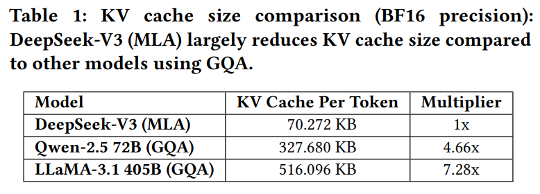 表 1 比较了 DeepSeek-V3、Qwen-2.5 72B 和 LLaMA-3.1 405B 中每个 token 的 KV 缓存内存占用情况。通过采用 MLA,DeepSeek-V3 显著减少了 KV 缓存大小,每个 token 仅需 70 KB,远低于 LLaMA-3.1 405B 的 516 KB 和 Qwen-2.5 72B 的 327 KB。