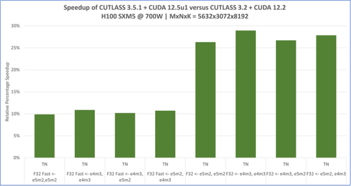 下图显示了自CUTLASS 3.1以来,NVIDIA H100(NVIDIA Hopper架构)的CUTLASS性能持续改进。其中CUTALSS 3.5.1是用CUDA 12.5u1工具包编译的,Tensor Core是使用CUDA的mma和wgmma指令实现的。