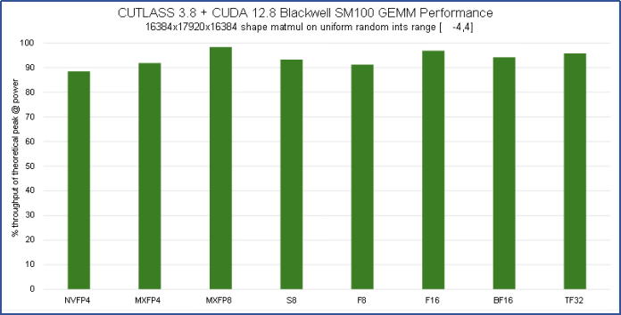 大部分人的刻板印象,就是抽象模板的方式可能会影响计算性能。不过CUTLASS原语是非常高效,当用于构建设备范围的GEMM内核时,对峰值理论吞吐量的利用率接近最优。下图显示了CUTLASS 3.8在NVIDIA Blackwell SM100架构GPU上运行时,在各种输入和输出数据类型上的性能占理论峰值利用率的百分比。