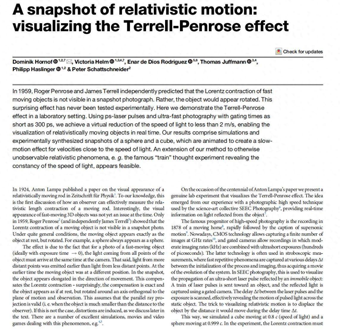 直到近期,维也纳大学的科研人员终于在实验室里再现了这一效果。采用激光脉冲与高速摄影机,他们成功模拟了接近光速运动的物体,并通过精密的光学计算,展示了特雷尔-彭罗斯效应的真实影像。值得注意的是,他们的实验速度并未达到光速,而是通过让光速减缓到2米每秒,从而用模拟的方式实现了这种视觉效果。