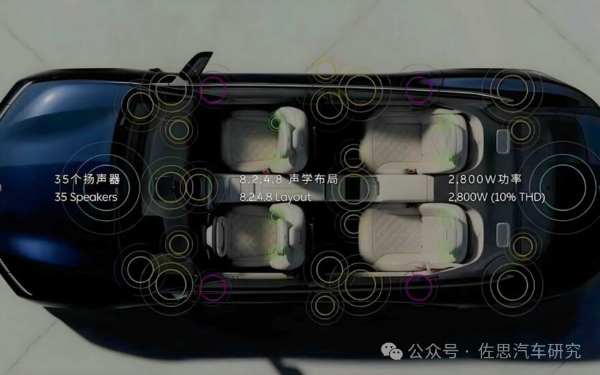 2025年上市的蔚来 ET9搭载了九霄天琴8.2.4.8蔚来沉浸声音响系统,包含35个扬声器,10%失真率功率2800W, 引入头枕扬声器、后排中置环绕单元,和前后双低音炮组合,每个座位都获得360°声场包裹,带来影院级临场感。