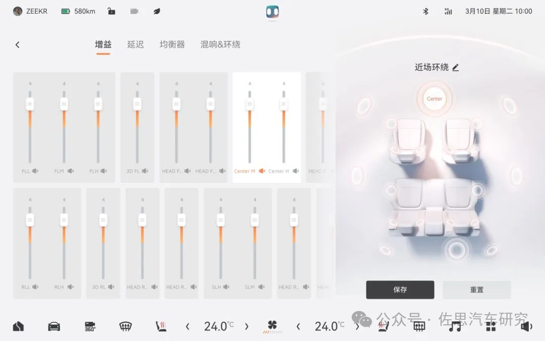 除声学硬件升级外,极氪Zeekr Sound系统还具备“调音极客”功能,能够实现全车所有通道增益、延时、均衡器的单独调节,以及整车混响效果的调整,从而定制出用户专属音效。同时,调音极客功能还支持共享,通过创建个性化音效后分享给他人,也可通过分享码添加其他用户的音效。