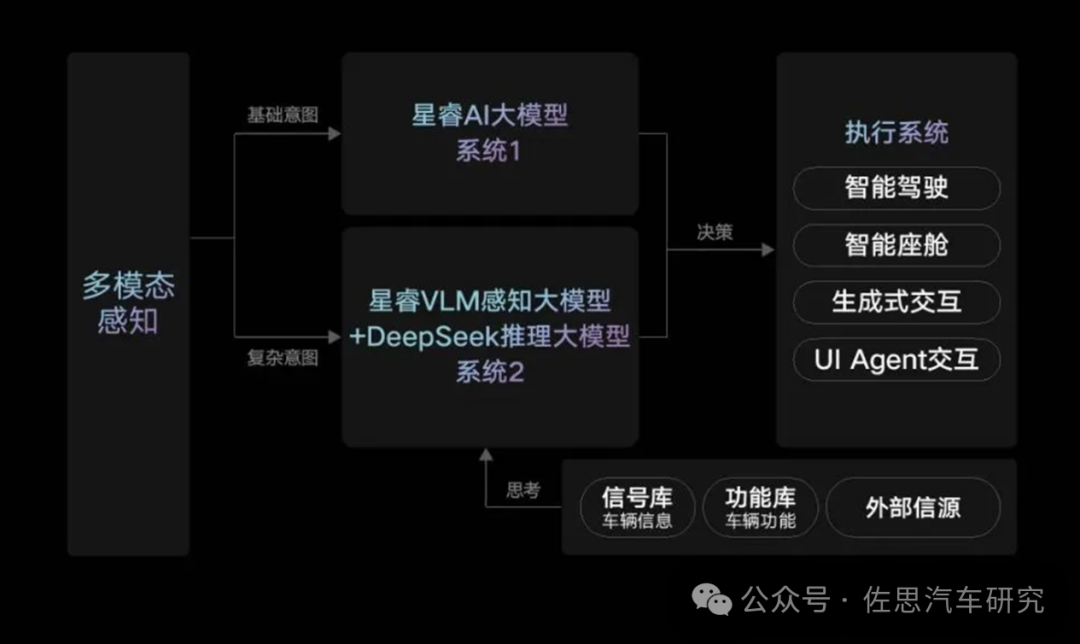 2025年2月,吉利星睿大模型与 DeepSeek-R1 深度耦合,基础意图交给星睿 AI 大模型系统 1 处理;复杂意图则由星睿 VLM 感知大模型与 DeepSeek 推理大模型组成的系统 2 处理。两个系统决策后,指令传至执行系统,控制智能驾驶、智能座舱、生成式交互和 UI Agent 交互等功能,同时决策过程会参考信号库、功能库和外部信源等。