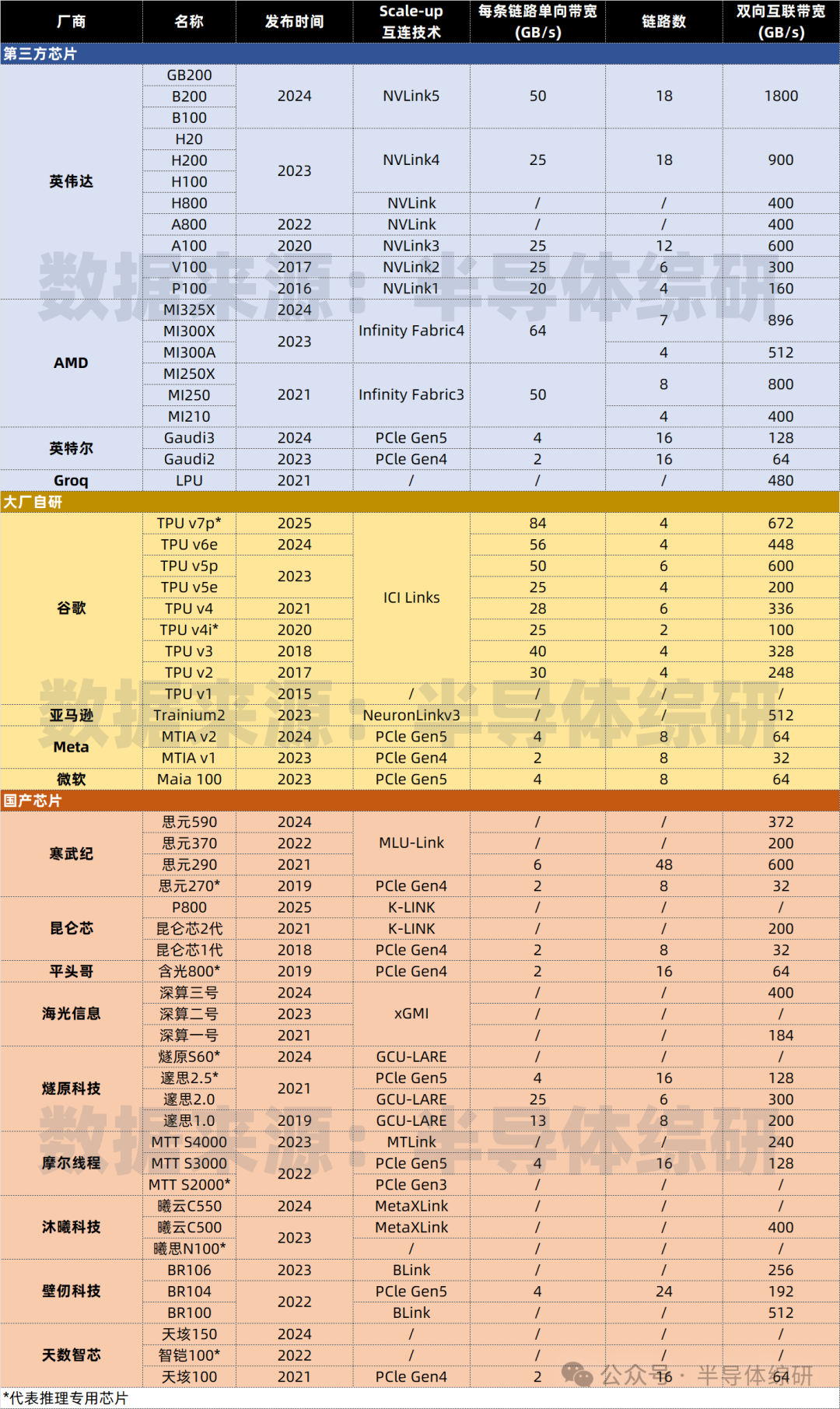 AI大模型能力的快速提升(如Qwen3、Llama4的多模态升级与逻辑推理优化)正推动AI从辅助工具向核心生产力渗透。而算力芯片的性能对大模型的训练、推理至关重要。本文通过统计全球主要算力芯片的算力、显存和互联带宽指标,对比海外第三方设计公司、海外大厂自研和国产芯片的单卡性能。不考虑软件(如CUDA)、Scale out架构(如华为CloudMatrix超节点)和成本。华为芯片缺少官方公布数据,所有暂时没有收录。