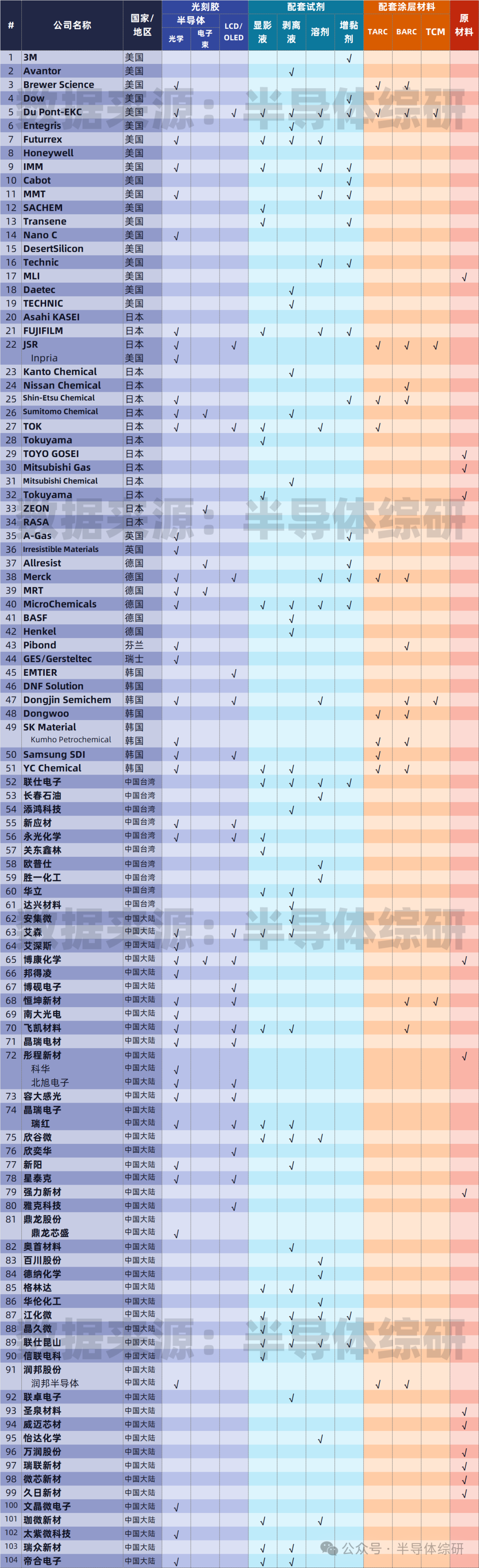 半导体光刻胶及配套供应商(104家)