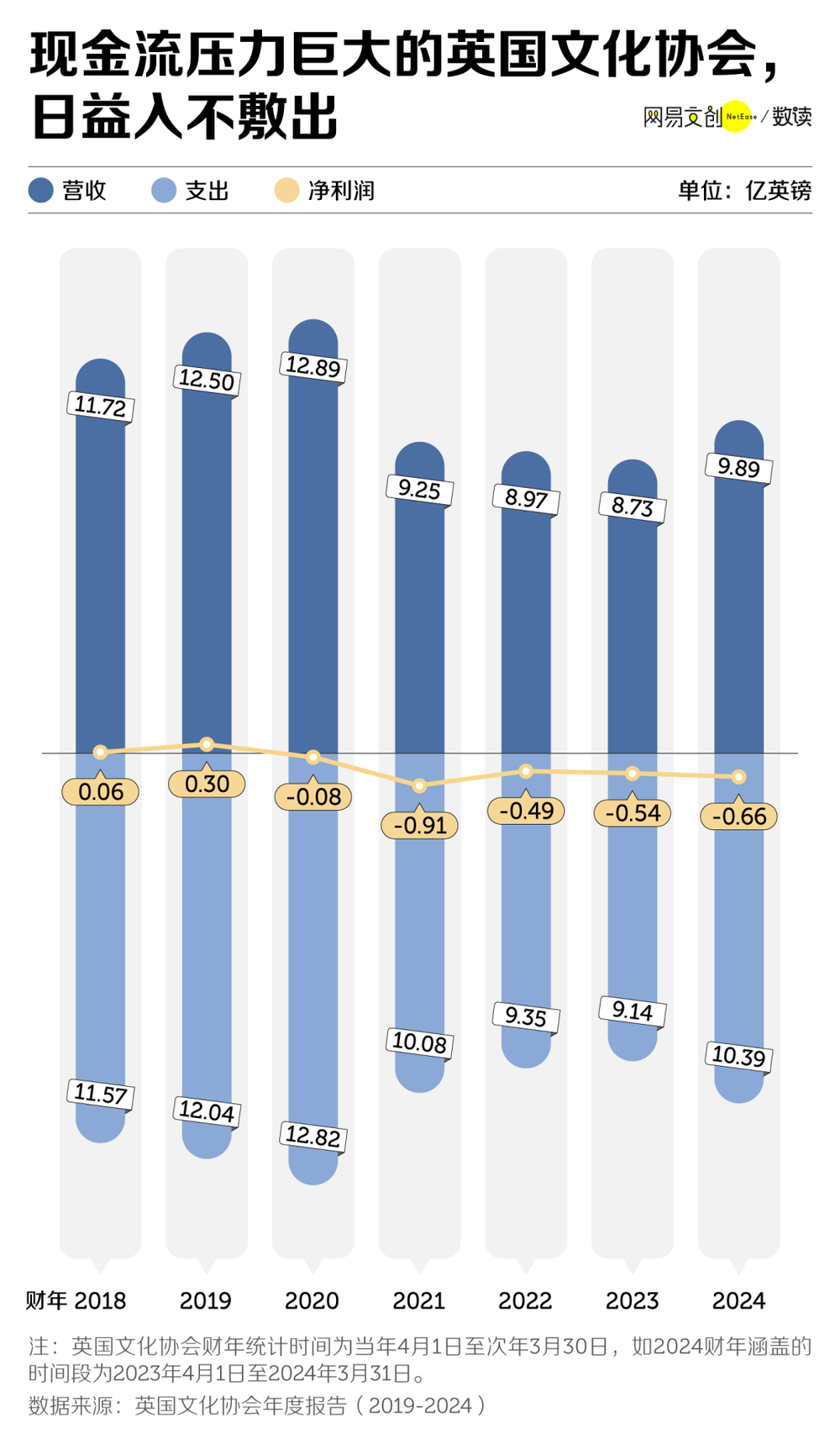 从此,财务压力如滚雪球般失控。2022 至 2024 财年,英国文化协会连续三年亏损,2024 年净亏 0.66 亿英镑,账上自由储备干脆跌到负值,成为 -0.43 亿英镑 [6]。