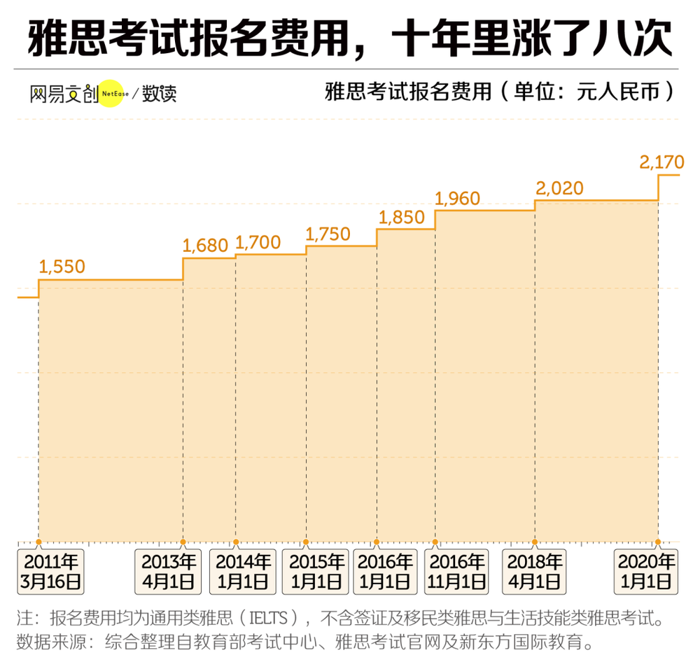 早在 2013 年,雅思价格就已经涨至 1680 元,2016 年更是毫不客气地一年内调价两次,再到 2018 年正式迈入 2000 元时代。
