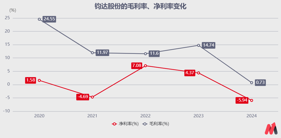 不过,值得注意的是,2024年钧达股份开始扛不住了,亏损了。