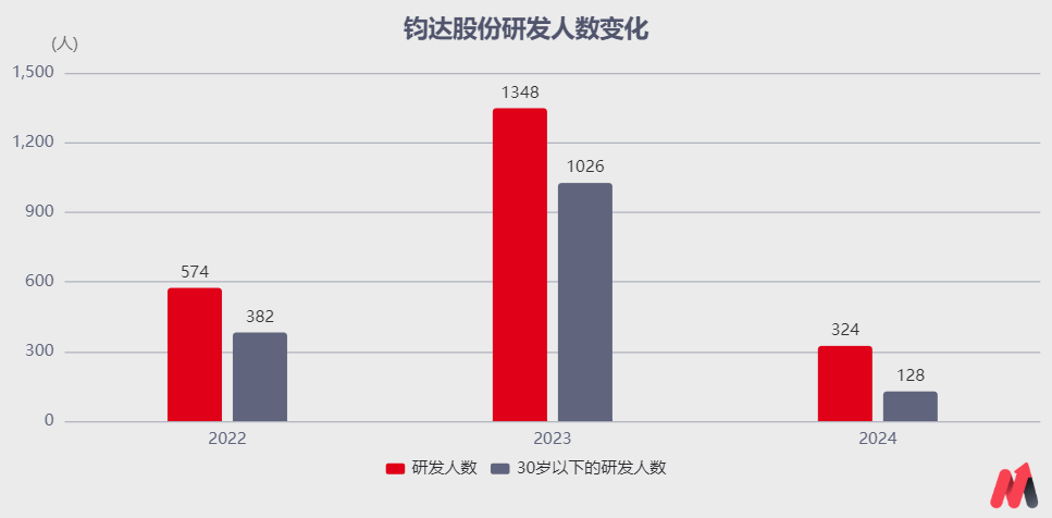 有意思的是,2023年钧达股份大规模招聘研发人员,研发人员从574人提升至1348人。2024年,公司又开始大规模裁人,研发人员从1348人降至324人。值得注意的是,研发人员增减的年龄段主要是30岁以下的。