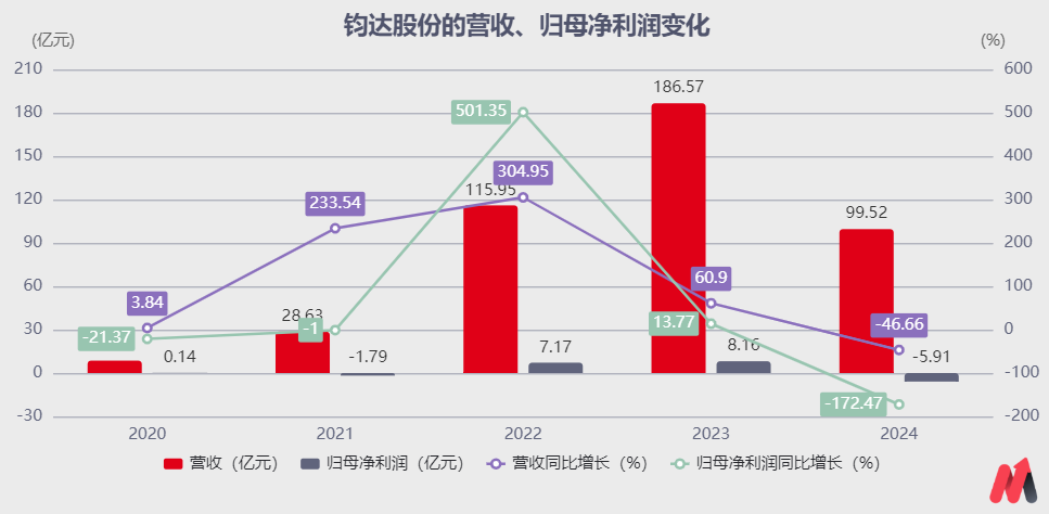 近日,钧达股份开始发布2024年业绩年报。2024年钧达股份实现营收99.52亿元,同比下滑46.66%;实现亏损5.91亿元,同比下滑172.47%。