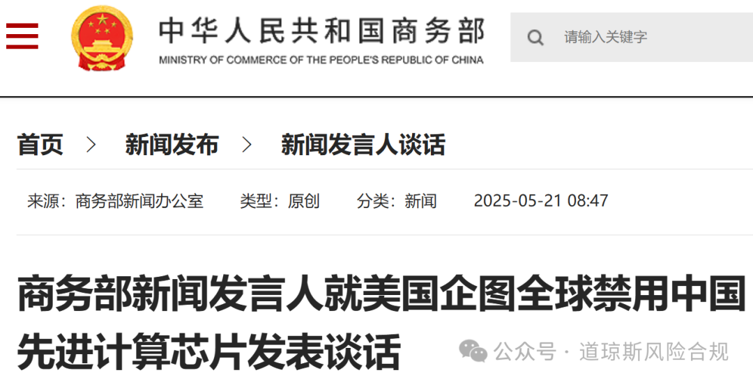 2025 年 5 月 21 日,商务部新闻发言人就美国企图全球禁用中国先进计算芯片发表谈话。