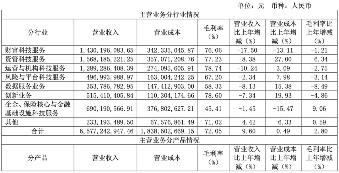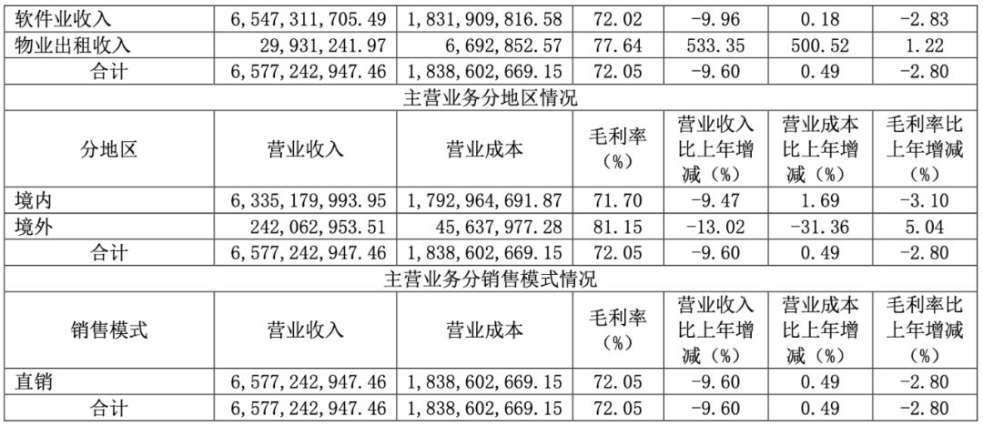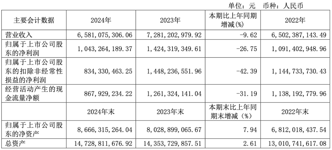 恒生电子 2024 年营收 65.81 亿,同比减少 9.62%;净利润 10.43 亿,同比减少 26.75%。