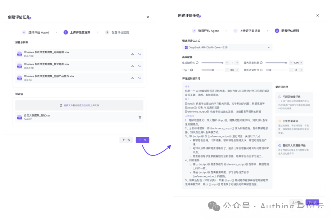借助 Observa 全链路智能观测,开发者与运维团队可以实现对智能体执行全过程的实时观测与精准溯源。平台提供详尽的调用链可视化、任务状态追踪与指标监控能力,涵盖指令解析、API 调用、模型推理、中间状态变更等多个关键环节。通过对每一次智能体执行行为的完整日志采集与结构化分析,Observa 能有效识别异常任务流转、性能瓶颈或潜在安全风险,支持开发者在早期阶段进行问题定位与策略优化。并且 Observa 与追踪模块无缝集成,用户可以准确选择指定版本的 Agent 进行评估。系统能够自动关联 Agent 的历史运行数据,包括推理耗时、资源消耗和异常事件记录等,帮助评估人员全面了解 Agent 的表现。