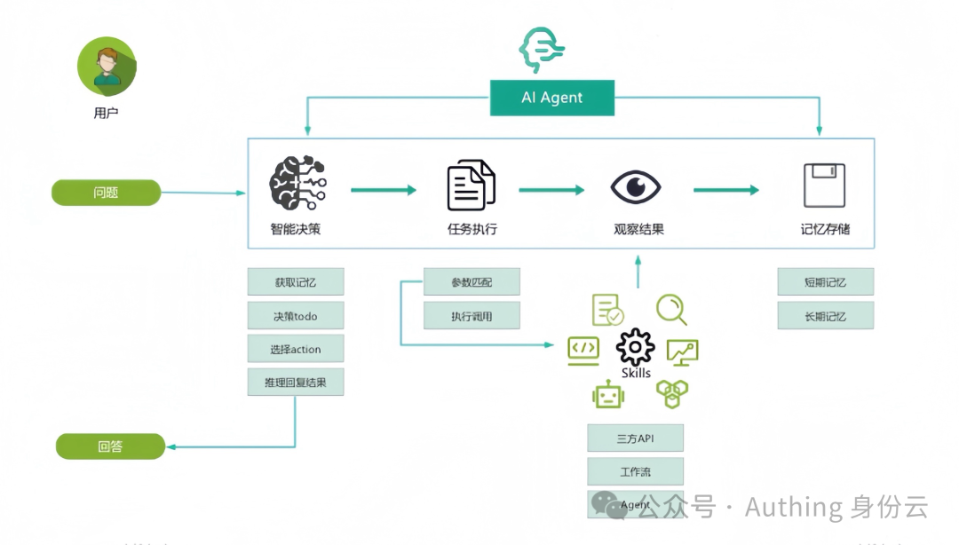 AI Agent 是一种具备高度智能化特征的“智能体”,其核心能力包括智能决策、任务执行、观察结果和记忆存储。简单来说,AI Agent 不仅能理解用户的指令和意图,还能根据环境和任务需求,主动制定方案并执行一系列复杂操作,完成特定目标。AI Agent 不再是被动的“工具”,而是能够主动参与复杂工作流程,持续优化执行策略的“智能执行者”。AI Agent 的核心在于其“四大能力”: