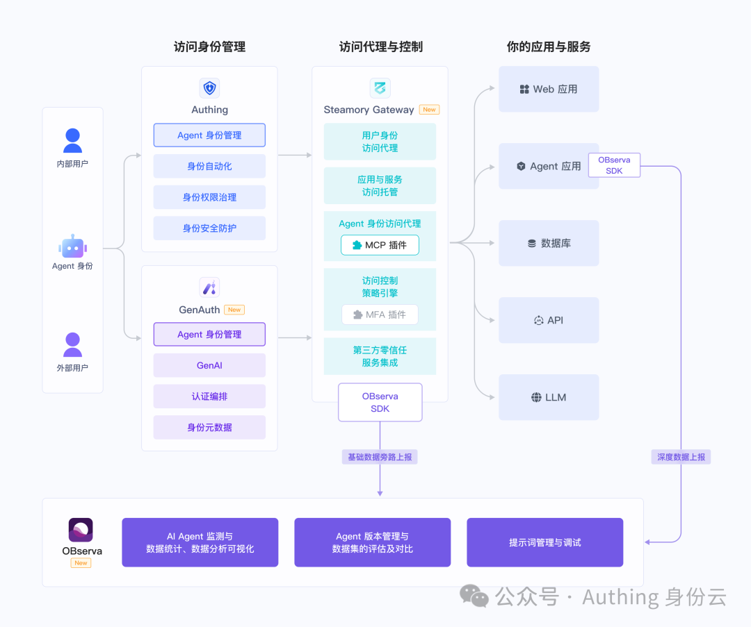 针对这些需求,蒸汽方舟提供了一套面向企业的 AI Agent 搭建解决方案,支持身份安全、任务监控、权限隔离等核心能力,帮助企业在保障数据安全的同时快速构建智能化流程。结合大模型能力、身份安全、工作流引擎与插件生态,帮助企业快速构建可落地的 AI Agent 系统。作为业内首个围绕 Agent Infrastructure 和 MCP 协议打造的企业级产品体系,蒸汽方舟通过 Authing、GenAuth、Steamory Gateway 和 Observa 四大核心产品的深度集成,共同构建起一套闭环的 Agent Infra 生态系统。利用 AI Agent 的能力,重建一个能够自主感知、理解、推理和响应的身份系统。