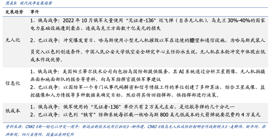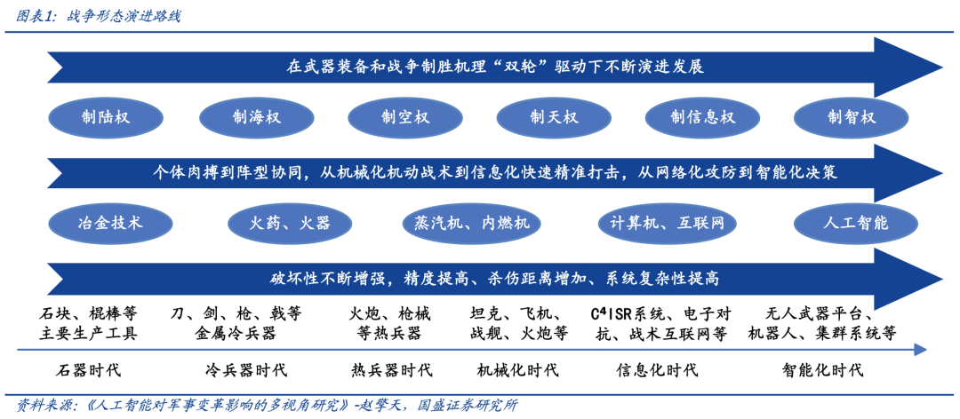我国在2019年7月,国务院新闻办就发布了白皮书《新时代的中国国防》并指出,以信息技术为核心的军事高新技术日新月异,武器装备远程精确化、智能化、隐身化、无人化趋势明显,战争形态加速向信息化战争演变。二十大报告也提出,要增加新域新质作战力量比重,加快无人智能作战力量发展,统筹网络信息体系建设运用。