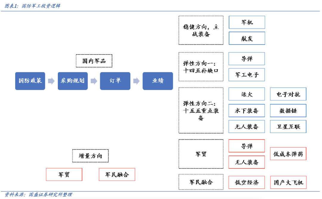 第一部分,国内军品方向,按照“国防政策—装备采购规划—装备订单—企业业绩”脉络寻找标的,机遇与调整并存。