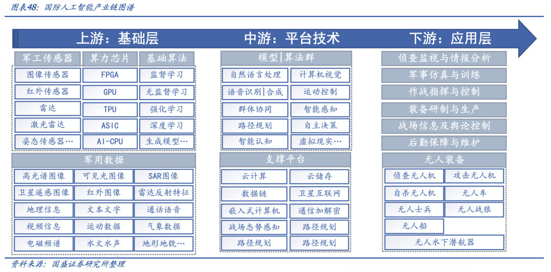 根据产业链划分,国防人工智能可分为上游基础层、中游平台技术层、下游应用层三大层级。上游先受益,中游技术颠覆性强,下游应用空间大。