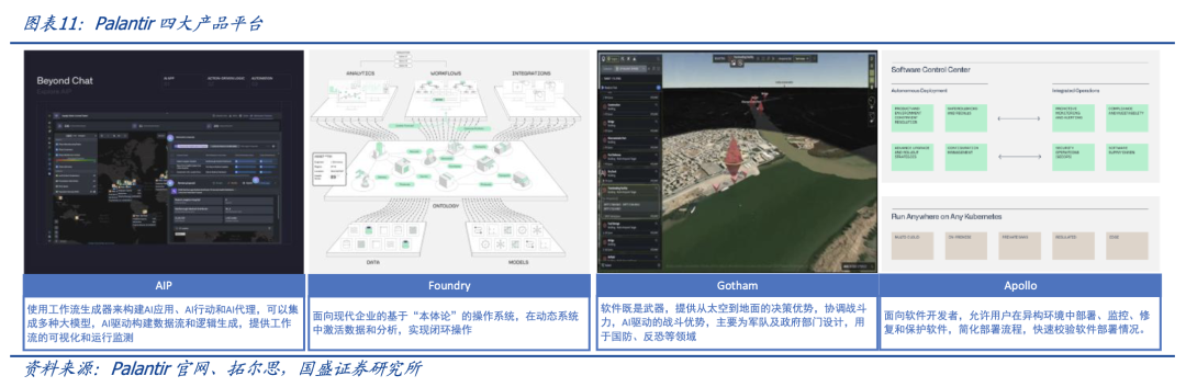公司主要有AIP、Foundry、Gotham、Apollo四大平台,产品本身不区分下游行业,而是提供不同能力的产品平台,可根据下游需求进行定制化的组合和开发,其中Gotham和AIP两大平台在情报分析以及作战指挥决策领域发挥着重要作用。