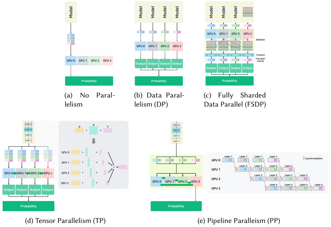 大模型过大,单卡上可能放不下。多卡多节点分布式并行处理,可以减少时延、增加利用率。并行算法受可用卡数量、互联带宽、访存层级、算力影响。主要方法有 张量并行 TP、数据并行 DP、FSDP、流水线并行。当然也可以采用混合并行。