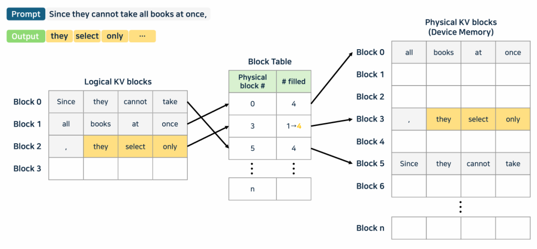 PagedAttention: 把 KV cache 切分成页表机制中的小片段,把逻辑块映射成物理块。