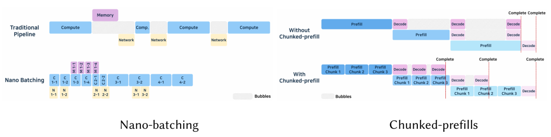 Nano-Batching 由 NanoFlow 引入, 对算子级别切分,单卡上并行 计算、访存、网络通信操作, 最大化利用资源和提高吞吐率。算子粒度分为 attention、KV 生成、GEMM、多卡同步集合通信。动态调整 nano-batch 大小,优化每类资源,调度算法基于硬件资源和算子优化,合并了拓扑排序和贪婪搜索。nano-batching 并发处理可以提升资源利用率,增加了吞吐率,但调度复杂,会导致额外的开销,尤其是多卡处理的时候。