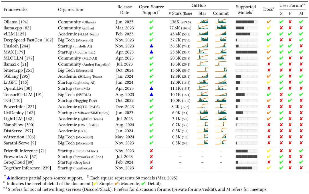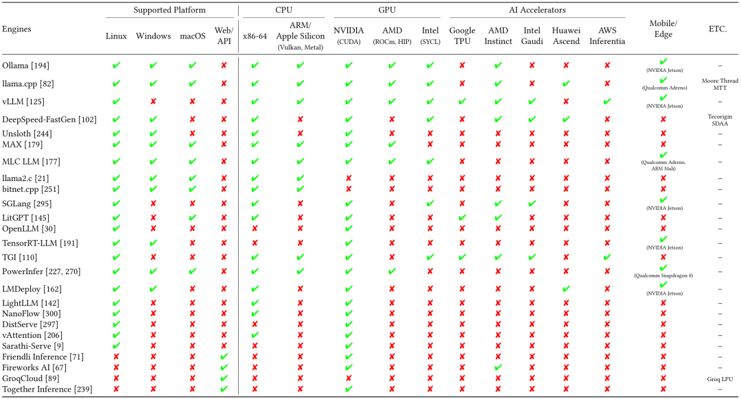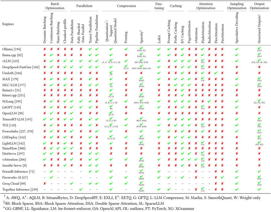 大模型推理引擎采用了多种定制化的优化技术,针对预填充和解码阶段进行优化。大多数引擎都使用了 KV Caching 避免解码阶段的重复计算,使用缓存的上下文,只计算最新一个 token。引入连续批处理和混合批处理,进一步优化解码阶段性能;对多个请求的分组预填充、分组解码可以更好利用GPU资源。解码阶段使用算子融合和硬件特有的加速计算核,减少每个token生成的开销。算子融合, 比如, 将 LayerNorm, 矩阵乘, 激活函数 融合成一个算子, 减少访存和 Kernel Launch 的开销。量化是另一个主要的优化方法。用 8比特或4比特整型,替换16比特或32比特浮点类型,对内存使用和带宽需求降低, 尤其是在解码阶段。量化模型可以缓存更多的 tokens , 处理更多的并发请求,提升计算速度。