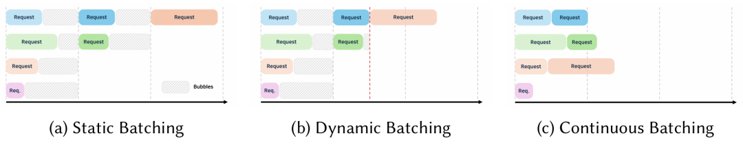 推理请求把多个输入请求分组打包同时处理,提升硬件利用率和吞吐率。除了批大小外,调度方法也会显著影响推理性能。static batching 处理固定数量的请求,新请求需要等待当前批请求完成后,才能开始推理,增加了推理时延。dynamic batching, continuous batching 实时自适应批请求,可以减少推理时延、提升效率。