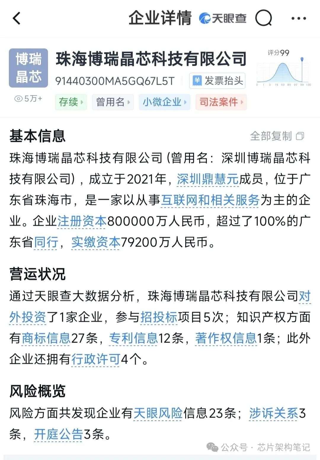 近日,天眼查上博瑞晶芯有了新的变动,名字从深圳博瑞晶芯科技有限公司变更为珠海博瑞晶芯科技有限公司。猜测这一变动可能是后续会由珠海市政府来对博瑞晶芯进行投资和扶持。