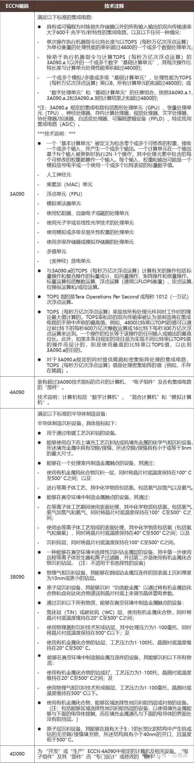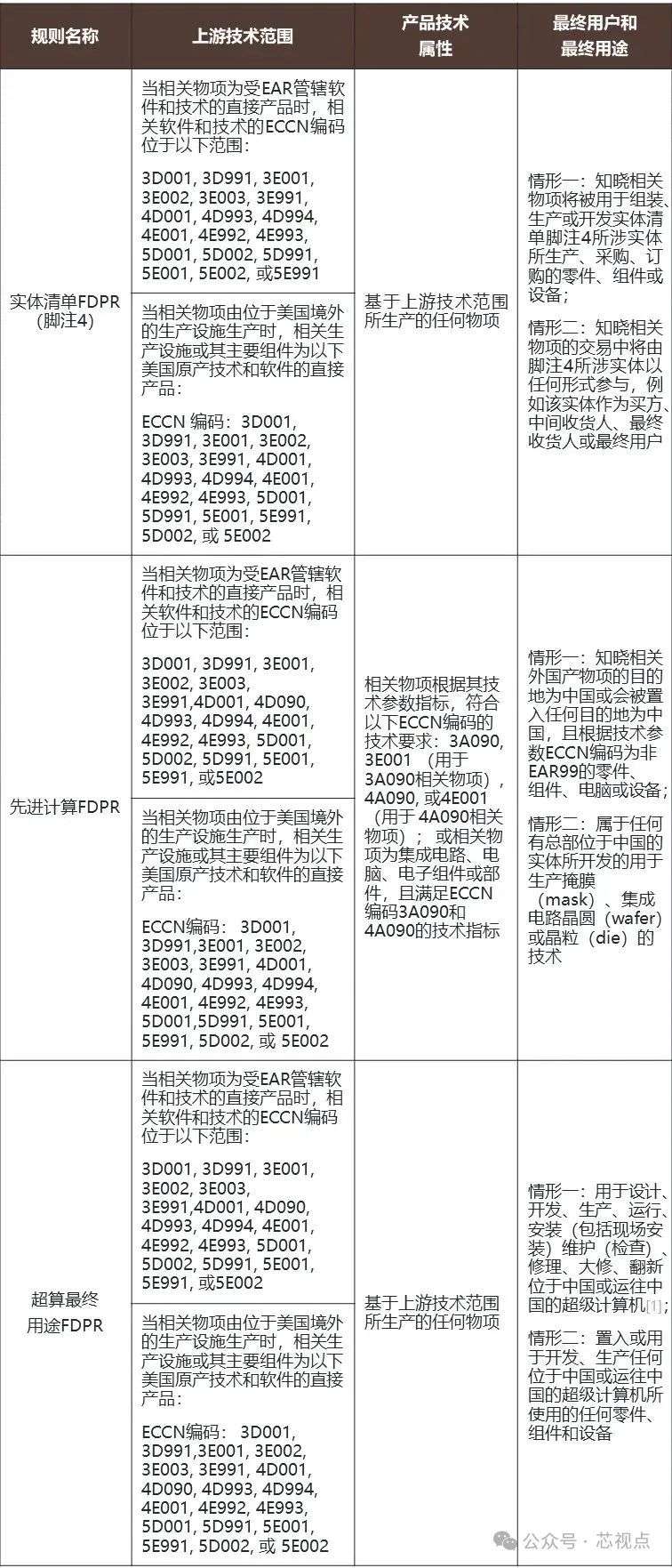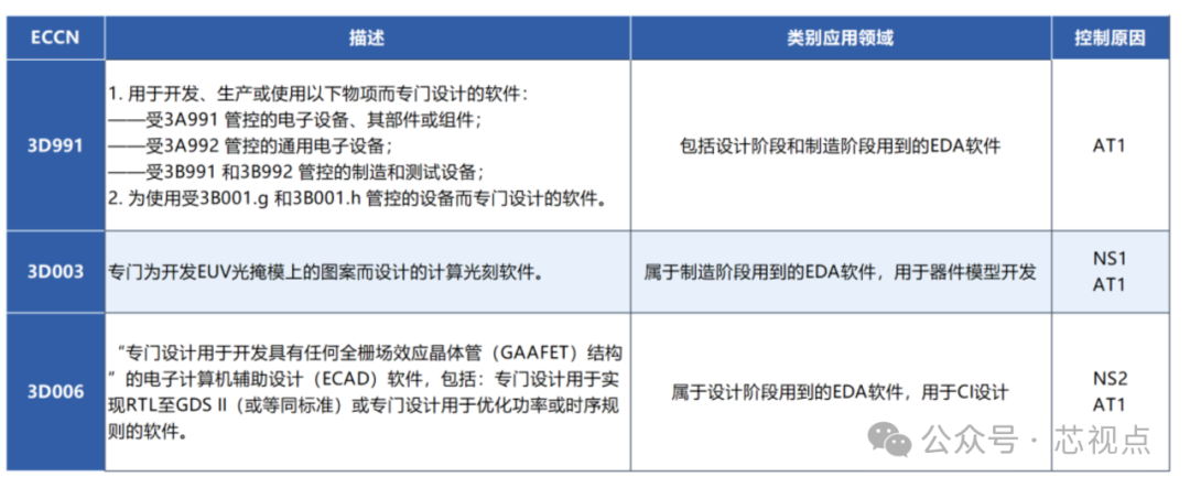 从上面Cadence的发布可以看到,这次限制主要涉及ECCN 3D991 和 ECCN 3E991 。 首先看关于3D991的说明: 3D991仅受AT(反恐)原因管控,对中国出口不需要许可证。3D991包括设计阶段和制造阶段用到的EDA软件。其应用领域具体包括: ——用于开发、生产受3A991 管控的电子设备、其部件或组件。3A991包含一系列未被归入3A001的芯片产品,如CPU,GPU,TPU, 存储芯片等等。管控原因仅有AT1(反恐),属于受管控程度较低的物项,出口到中国不需要许可证。需要特别说明的是,在今年10月份CCL更新之后,3A991项下新增了一个子项,3A991.p,列入处理性能为8TOPS或更高的集成电路;或双向传输带宽合计为150 Gbyte/s或更多的集成电路。性能低于另外一个ECCN编码3A090,但是高于上述水平的相关芯片产品均被归入3A991.p项下。 ——用于开发、生产受3A992 管控的电子设备、其部件或组件。3A992包含一系列未被归入3A002的,管控原因仅有AT1(反恐)的通用电子设备。 ——用于开发、生产或使用受3B991 和3B992 管控的制造和测试设备而专门设计的软件。3B991和3B992包含一系列半导体和电子产品生产所用到的设备。 ——为使用受3B001.g 和3B001.h 管控的设备而专门设计的软件。其中3B001.g是为受3A001 管制的集成电路设计的光掩模版;3B001.h是3B001.g 条目中未明确的具有相移层的多层光掩模版,设计用于光源波长小于245 nm 的光刻机。