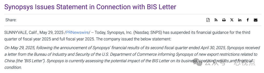 新思也发布声明表示,2025年5月29日,在新思科技(Synopsys)公布截至2025年4月30日的第二财季财务业绩后,新思科技收到美国商务部工业和安全局(BIS)的一封信函,告知其与中国相关的新的出口限制(“BIS信函”)。新思科技目前正在评估BIS信函对其业务、经营业绩和财务状况的潜在影响。